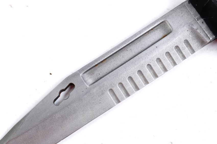 An original 20th century Gulf War era British Army issued SA80 / SA 80 rifle bayonet. Bayonet of typical form, with socket to one end and a single-edged fullered blade. Housed in its original and correct canvas camouflaged scabbard with frog. Total size approx; 38cm long.