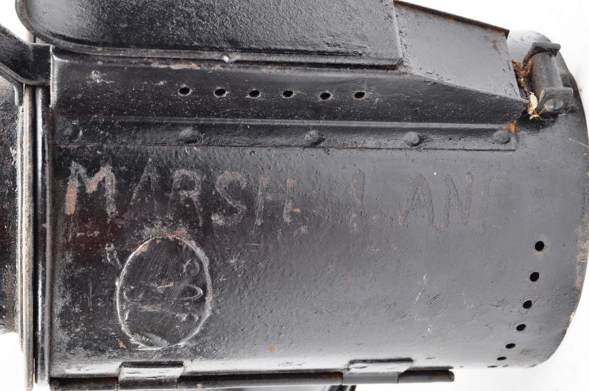 An original vintage early 20th century c1930s British Rail LMS Railway signalling lamp from Marsh Lane station, Leeds. Raised ' LMS ' notation to side, with remnants of ' Marsh Lane ' painted to the other. Retains its original slatted blue and red glass covers and interior burner. Measures approx;  32cm tall.