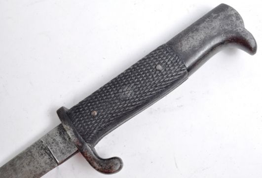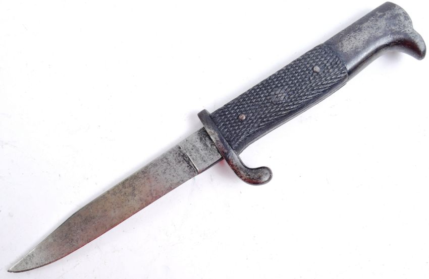 A WWII Second World War Third Reich Nazi German trench combat knife / boot knife. The knife having a bayonet type handle with hooked pommel and checkered wooden grip. The backward facing quillon leading to a single edged clipped blade. Housed a in a steel scabbard with leather frog. Measures approx 30cm.