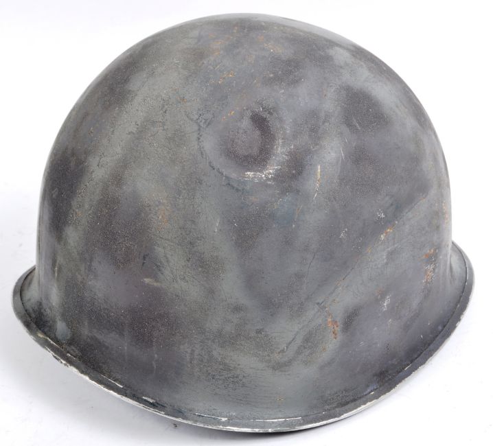 An original WWII Second World War American M1 infantry steel combat helmet. Front seam, with fixed bales. No liner, partial chin strap remains. Faint insignia marking to front and camouflage paint. No impressed markings to shell.