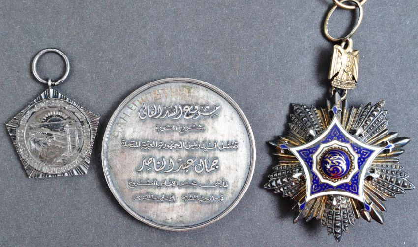A 20th Century Egyptian Order of Merit Nishan Al-Istihqaq Grand Cross sash badge with associated medals. The medal issued to high ranking Soviet official Leonid Semenovich Peshekhonov for his participation in the construction of the Aswan High Dam in Egypt in 1959 Peshekhonov was in charge of the entire Aswan Dam construction vehicle movement network, and subsequently working on the Tripoli Dam in Libya as well as the liquidation of the Chernobyl nuclear disaster. He was also awarded the Order of the Patriotic War, the Victory over Germany medal, and many other Russian medals.