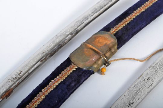 A pair of early 20th Century Indian cavalry type swords having a nut to the pommel with tiger head, a brass hilt with half-basket guard and a long curved blade with etched scroll work. Housed in red and blue velvet wrapped wooden scabbards. Measures approx 97cm