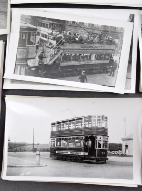 A large collection of 70+ vintage black and white photographs of trams and trolleybuses - from various location, and images appearing to date from early 20th century up to the 1950s or so. All appear to have been published in the late 1940s / early 1950s and carries a photographer's backstamp to each - some with date. Fascinating lot for the tram enthusiast. All 6x4" (approx).