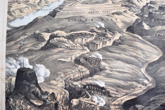 Crimean War / Crimea - two antique 19th century Victorian prints:- A Panoramic View of the Sea of Azov, Kertch, Yenikale, Arabat etc. shewing the position recently taken by the Allies, likewise comprising the whole of the Crimea. Engraved by Butler, printed by Stannard and Dixon London June 5th1855, projected by kind permission from the latest government charts & plans & from sketches on the spot by a military engineer. On linen, size 75 by 56 cm. An original hand-coloured lithograph print.- Panoramic View of the Malakov Tower and Outworks, the Redan Battery, the Mamelon and the Quarries. Engraved by Thomas Packer, printed by Stannard and Dixon London June 9th1855. On linen, size 75 by 56 cm. An original hand-coloured lithographic print. Beneath the title is some text explaining the strategic importance of the quarries and the Mamelon works, with further information about the allied plans to attack. A French translation of title and text is also provided. Troops, gun batteries, and the Russian defences are shown in considerable detail.