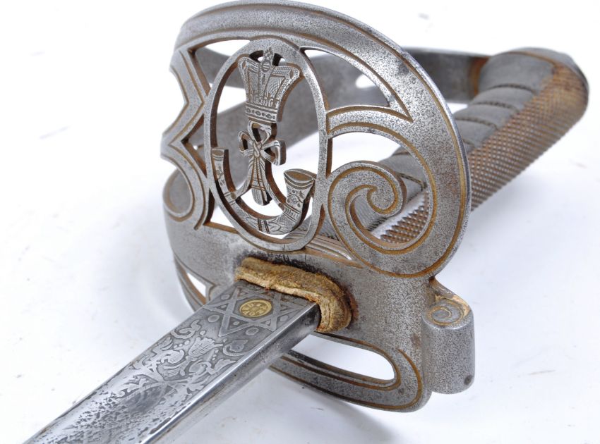 An original George VI 1827 pattern British Light Infantry / The Rifles regiment officers sword. The sword having a dome shaped pommel with ball finial and textured wire wrapped grip. The pierced half-basket guard having the regimental bugle below the Royal crown. The ricasso marked with the 6 pointed ' proved ' star and scrollwork engraving. Housed in a brown leather scabbard. Measures approx 100cm.