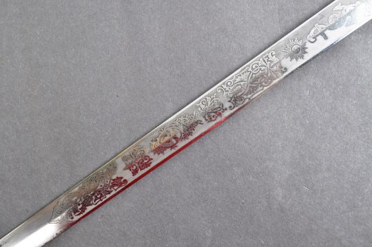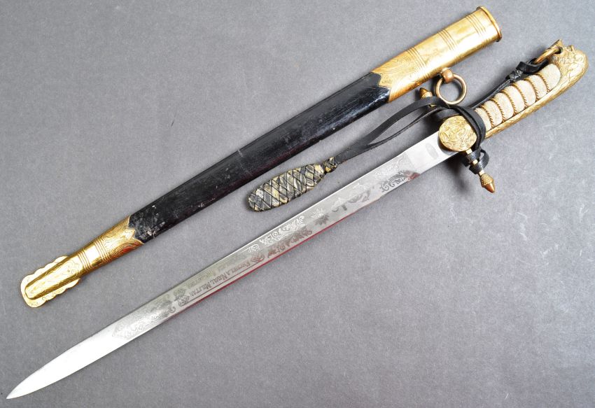 A 19th Century Argentinian midshipman / apprentice officers Naval dirk / dagger. The dirk being an 1879 pattern example with brass lions head to the pommel with its mane covering the side of the wire bound grip. The cross guard bearing the Argentine Navy emblem with press stud to the reverse leading to a double edged blade adorned with anchors, scrollwork and the words ' Escula Naval Republica Argentina '. Housed in a leather wrapped scabbard with brass furniture. Measures approx 59cm.