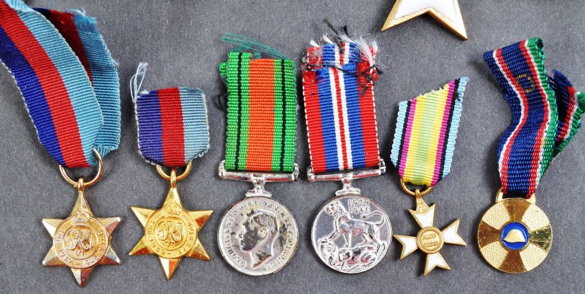 A WWII Second World War medal group awarded to one Raymond Arthur Balch of Bristol, enlisted in the Royal Navy. The medal group comprising; 1939-45 Star, France & Germany Star, Defence Medal, War Medal, Allied Cross (AF), and 'Medaille De La Alliee '. All with original ribbons, mounted on bar. With miniatures. Supplied with an archive of paperwork relating to Balch, to include; his Certificate Of Service (showing him on active service in 1943 aboard various ships as a telegraphist), various Record Sheets, a photograph of Balch in uniform, various cloth patches, HMS Flying Fox cap tally, HMS Venture Cap Tally, Balch's Bowson's whistle, and other items.