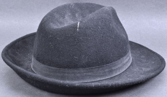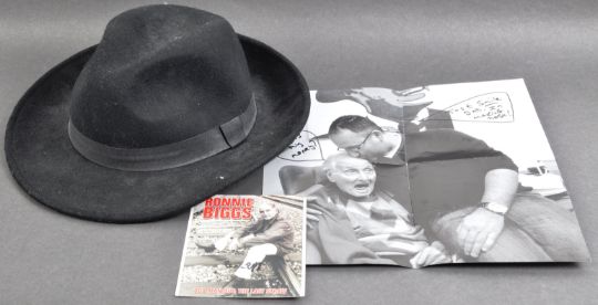 The Great Train Robbery - Ronnie Biggs (1929-2013) - an original vintage Fedora hat owned and worn by Biggs. Black, with a black band around the brim. Made in France. Retains original label which has been written 'Biggs' in Biggs' hand. Supplied with a folded magazine photograph of Biggs wearing a similar hat (the photograph has been hand annotated by Biggs) and a promotional card signed by Biggs in black ink.