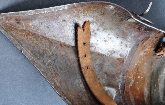 A pair of 20th Century iron gauntlet style medieval / English Civil War type plate armour props. The armour comprising x2 shoulder ( spaulder ) plates with articulated hinge joints and multiple leather suspension straps. Each to measure approx 35cm.