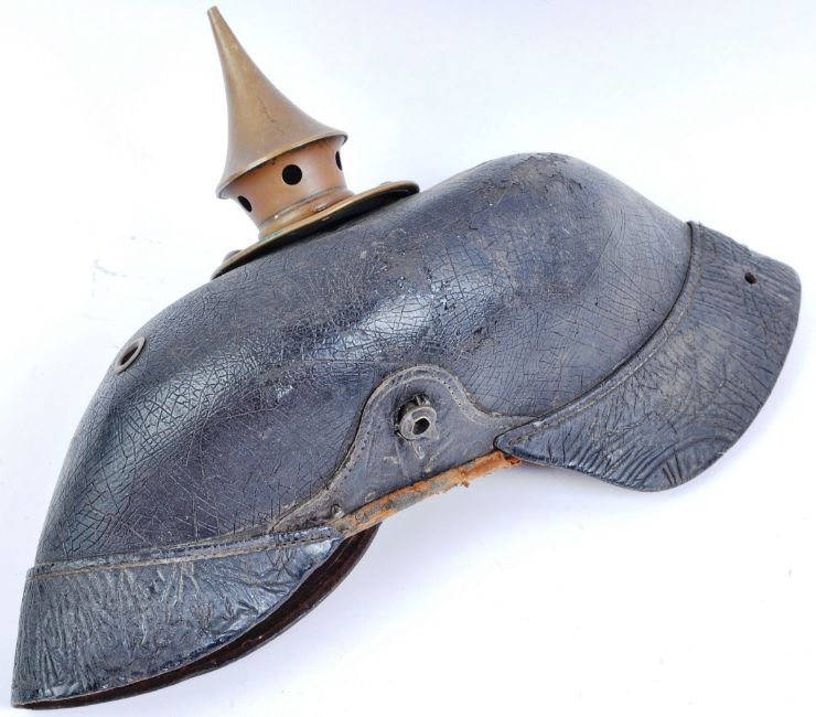 A collection of x3 original WWI First World War Imperial German Army assorted uniform items, comprising; an original Pickelhaube leather uniform helmet (AF - crushed, lacking badge but retaining top spike), an original German Army water canteen with bullet hole to one side, retaining original covering and stopper. Along with a period German soldier's enamel food canteen. Interesting assortment of period items, each labelled where it was discovered immediately post-war.