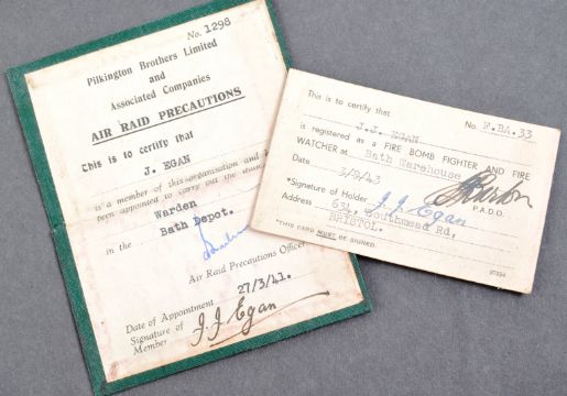Local interest - a collection of original WWII Second World War ARP Air Raid Precautions related effects to one J.J Egan who was a Warden at the Pilkington Brothers Bath depot. Items to include his registration card and certificate, x2 Fireguard cloth armbands and an ARP uniform button.