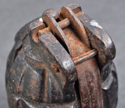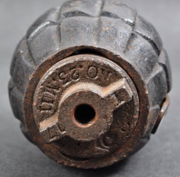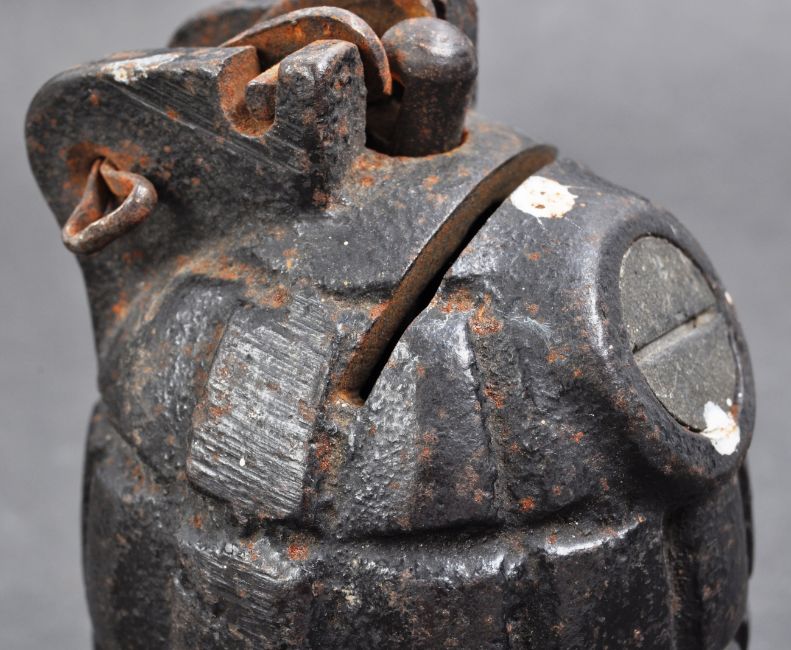 An original WWI First World War era No.23 Mk. II British Mills Bomb hand grenade - with rod grenade attachment to base. Later fashioned into a small money box, by means of a slot to top. Clip present, and screw-cap to base. Rare item. Measures approx; 10cm tall.