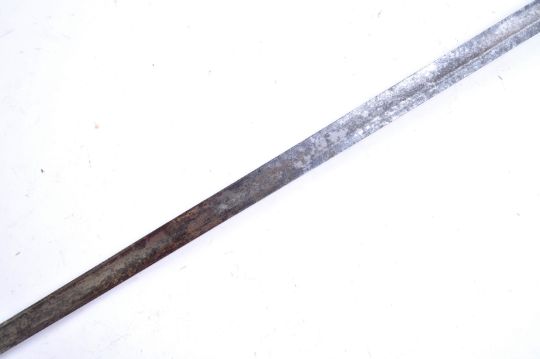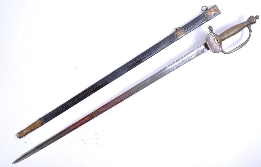 A 19th Century antique British Infantry Officer's George III / 1796 pattern sword. The sword having an urn shaped pommel with acanthus leaf decoration and finely ribbed grip with knuckle guard. The folding crossguard (AF) having one side faintly engraved for an Honorary Reward Cadet and dated 1811. The long straight blade housed in a black leather scabbard with bradd furniture. Measures approx