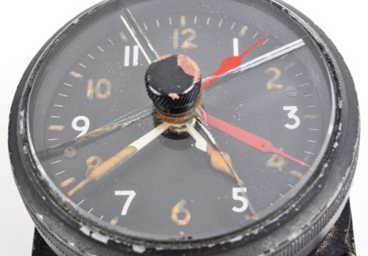 An original WWII Second World War RAF Royal Air Force fighter aircraft cockpit clock (likely Spitfire / Hurricane). Arabic numerals to the black dial with 6A / 1002 One Day. Dated 1944 to the reverse. Screen AF. Measures approx 6x6cm.