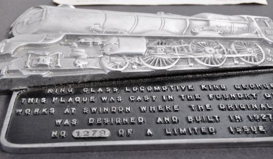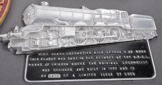 Railwayana - Two British Railways and Great Western Railways cast aluminium commemorative plaques. One plaque celebrating the GWR King Class 4-6-0 locomotive King George V cast in the Swindon locomotives works together with a certificate signed by the Works Manager, H.R. Roberts and the other plaque reading ' Great Western Railway Company ' with belt buckle border and painted central armorial plaque depicting shield, boat and castle. Largest to measure approx 29cm.