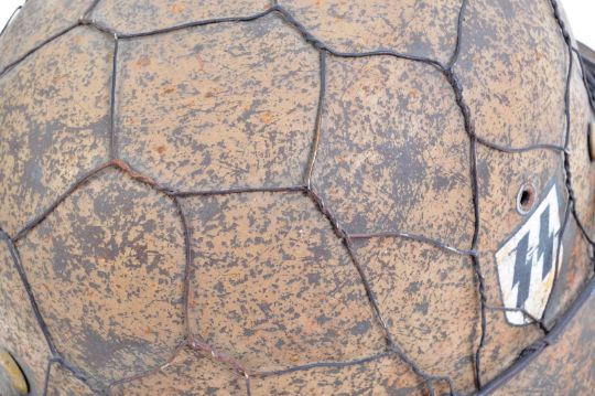 An original WWII Second World War Third Reich Nazi German Army stahlhelm M42 pattern steel uniform combat helmet. Later painted to represent a single-decal Afrikakorps / Desert camouflage SS helmet, complete with wire basket to top. The original shell impressed ET64 to side brim and a faint batch number to the rear. Fitted with a replica liner and chinstrap. Repainted by the vendor for display purposes. Original shell, later painting.