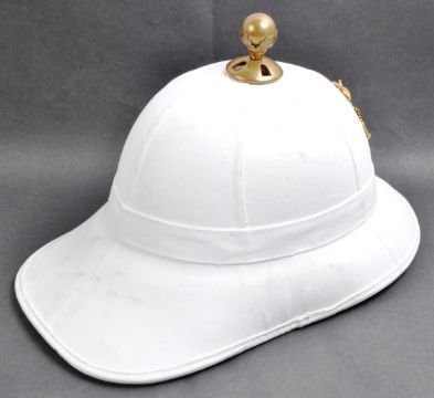 An original 20th century Royal Marines pith / topee helmet. White rigid fiber construction with Queen's Crown badge to front, complete with inner liner and chin strap.