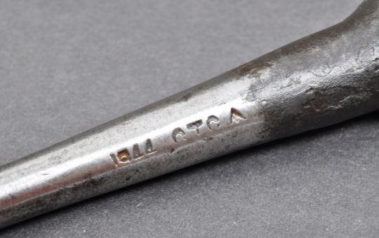 A collection of assorted WWII Second World War and later Royal Navy officers uniform caps and marlin spike tool. The caps to include a 1943 dated WRNS Women's Royal Navy Service navy cap, a circa 1950's HMS Heron cap with tally and a 1944 dated steel Royal Navy marlin spike tool with broad arrow mark to the shaft. Measures approx 23cm.