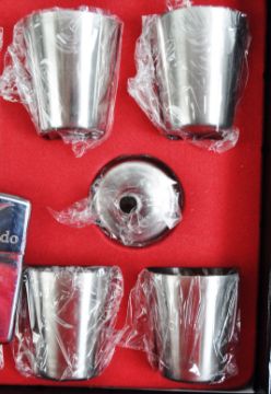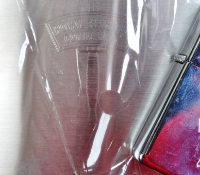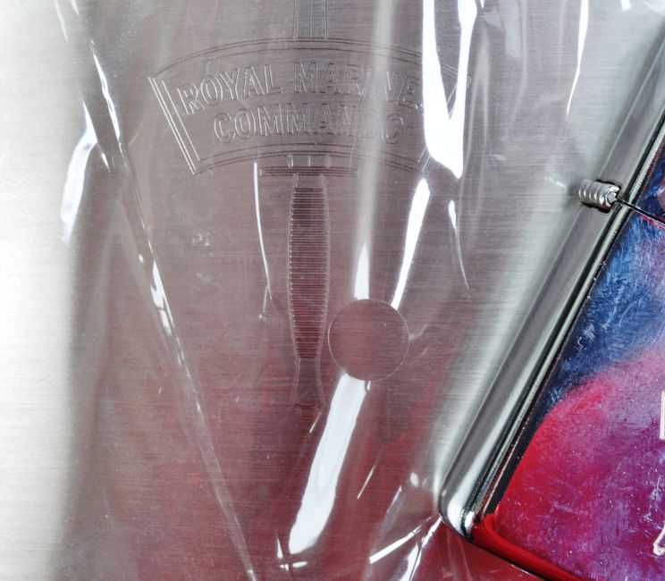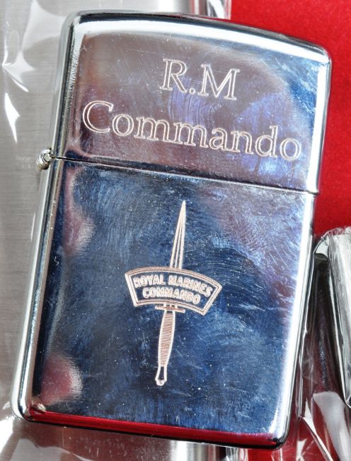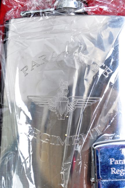 Two British Royal Marines related hip flask and cigarette lighter boxed gift sets. Each to contain a stainless 8oz steel hip flask, x4 shot containers, a funnel and windproof lighter. One set engraved with ' Parachute Regiment ' and the other ' Royal Marines Commando '. Both appearing new and unused.
