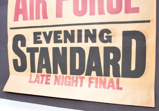 A scarce original WWII Second World War advertising billboard newspaper stand poster for The Evening Standard, with headline ' Goering On 'My Ruthless Air Force'.  Red and black text, on white. Printed on newspaper stock. Measures approx; 76cm x 51cm. Scarce surviving wartime Battle of Britain related poster.