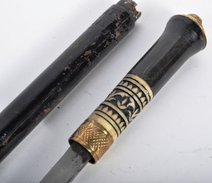 A late 19th Century Indian gentleman's sword stick / walking cane with concealed blade. The cane having a brass pommel engraved with tigers head, ivory and brass collar leading to a stiletto blade etched with ' India ' to the ricasso. Housed in a black lacquered wooden handle. Measures approx 93cm.