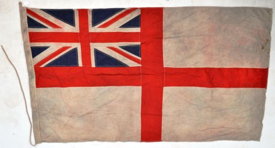 A WWII Second World War interest large Royal Navy White Ensign flag of typical form in white, with Union Flag to corner. The seam stamped with broad arrow and various other official markings. Measures approx; 94cm x 155cm.