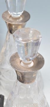 A collection of 20th Century silver and silver plated items to include a pair of cut glass decanters with silver hallmarked rims, a cased silver plated set of four table salts, a silver hallmarked cruet set in case including mustard pot, pepperette and table sale (hallmarked Birmingham 1923), a pair of silver hallmarked spoons in case (hallmarked London 1903). Approx weight 200g.