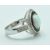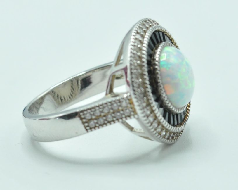 A stamped 925 silver Art Deco style ring having a central opalite stone surrounded by a halo of black stones and CZ's as well as CZ's set to the shoulders. Stamped 925 to the inner band. Size Q.5. Total weight 8g.