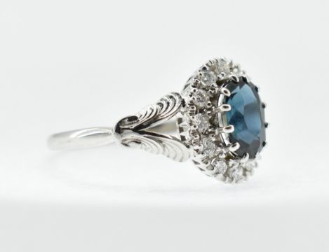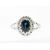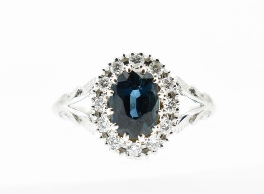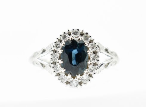 An 18ct white gold, sapphire and diamond cluster ring. The ring set with an oval cut sapphire surrounded by a halo of round brilliant cut diamonds having stylised bi-furicated shoulders to plain shank. Total weight 3.5g / Size Q.5