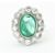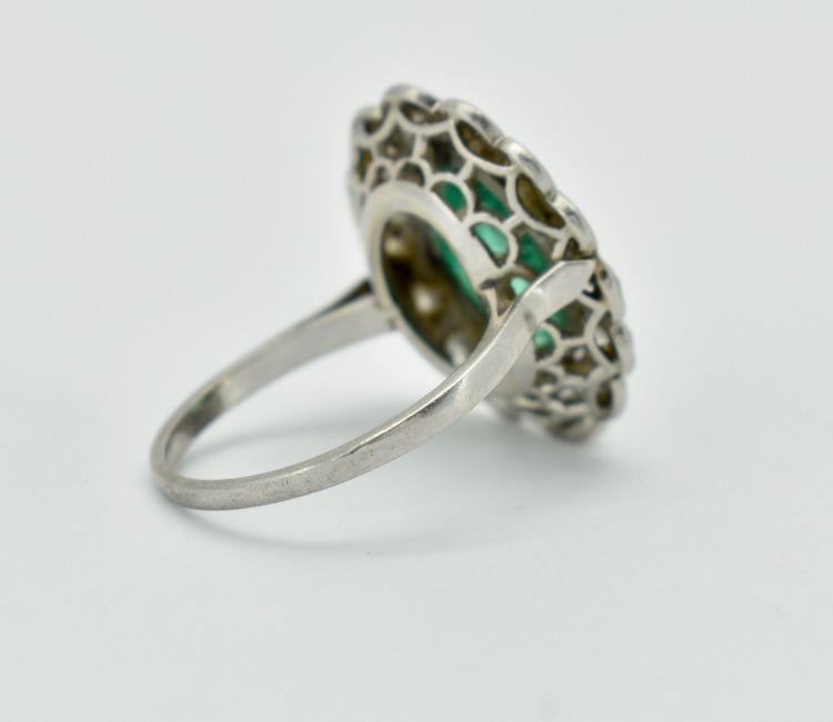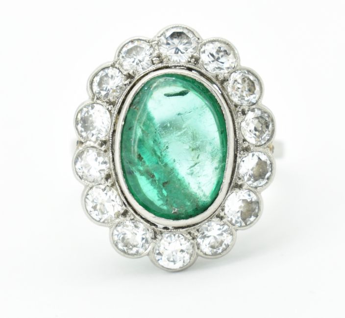 A platinum, emerald and diamond cluster ring. The ring set with an emerald oval cabochon within a halo of round brilliant cut diamonds. Emerald measures 12.5mm x 9.5mm x 5.3mm. Estimated total diamond weight 1.4ct. French Mascaron marks to shank. Total weight 7.28g / Size P.5