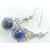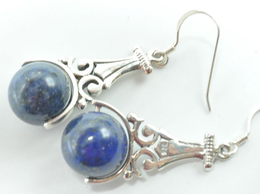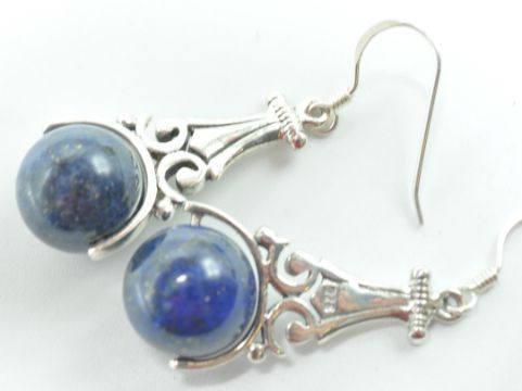 A pair of stamped 925 silver drop earrings having a lapis lazuli bead held within a shaped silver mount. Measures 32mm long. Total weight 8g.