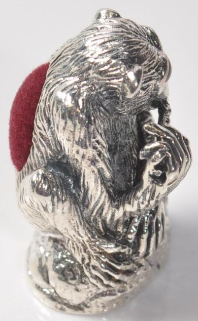 A stamped 925 sterling silver pin cushion in the form of a monkey with engraved features and glass eyes sat upon a rock with red felt cushion to the back. Stamped to the base. Measures 31mm tall. Total weight 23g.