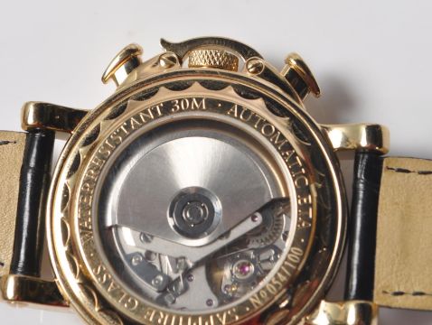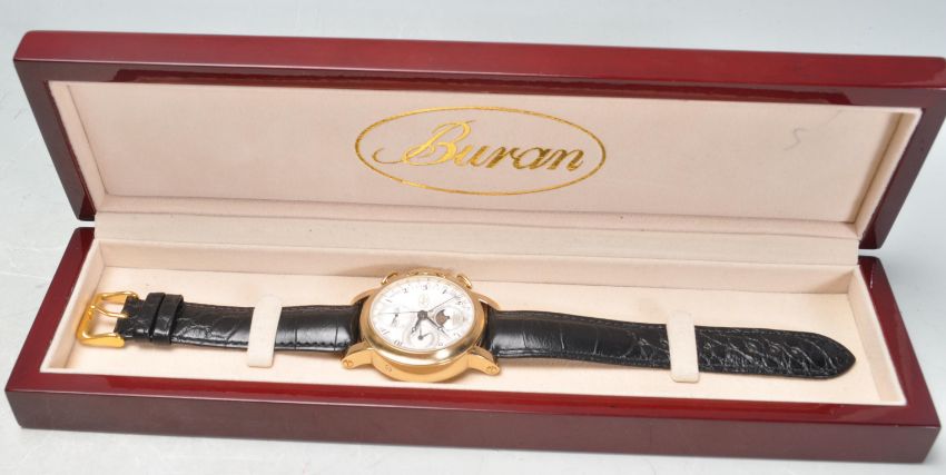 A gentleman's Buran Flagman Chronograph Automatic 25 jewels limited edition No. 054/100 wristwatch with Cal 7751. The watch having having white dial with arabic numerals to the chapter ring, day date to the arabic numerals to the chapter ring,60-second chronograph (central stop second),  30-minute counter (on 12h) with day and month aperture, secondary second dial to 9 o'clock and 12-hour counter (on 6h). The white metal movement is unmarked and set in a yellow metal case with sapphire glass back and black leather straps. The watch come complete with owner manual and original presentation box. Condition: good condition, no visual damage. At the time of arriving the watch was ticking and winding but sold as untested.