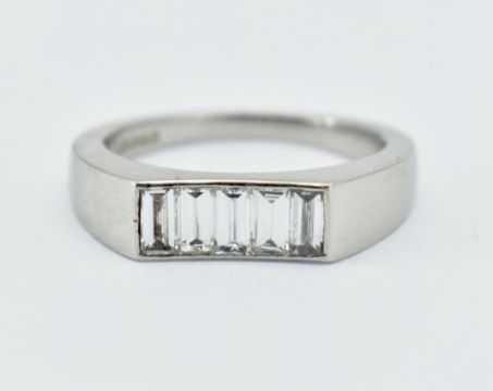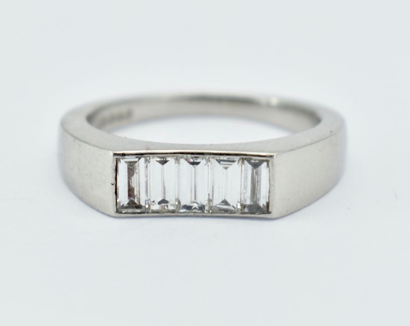 A hallmarked platinum and diamond ring. The ring set with five baguette cut diamonds to a contemporary concave setting. Estimated total diamond weight 0.50ct. Estimated clarity VS. Hallmarked for platinum. Weight 7.83g. Size M.
