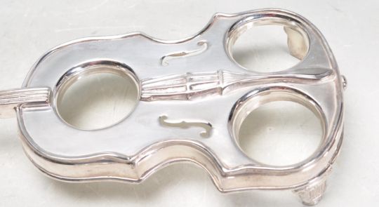 A silver plated condiment cruet set in the form of a cello having cut glass salt and pepper and mustard pots with hinged lids set in a plated stand. Stand marked to the base.