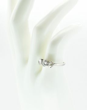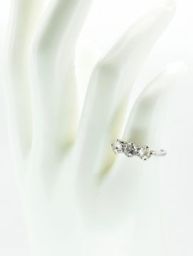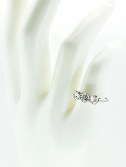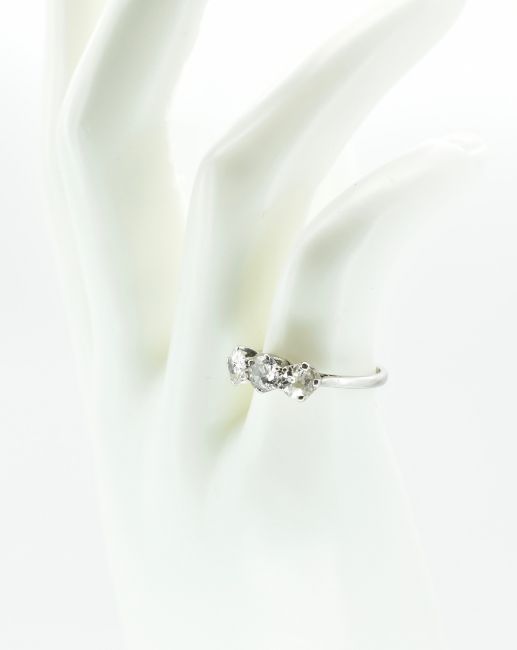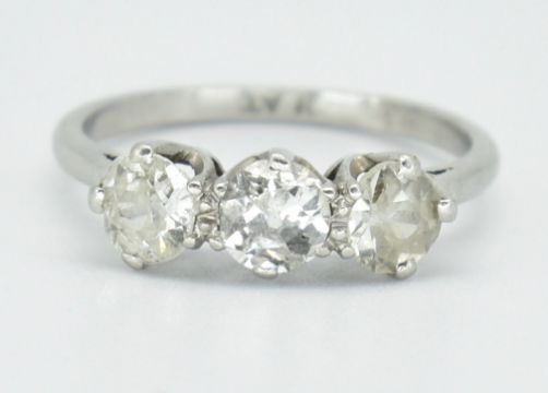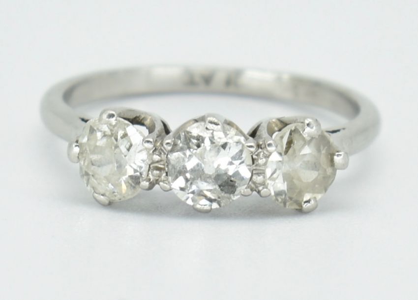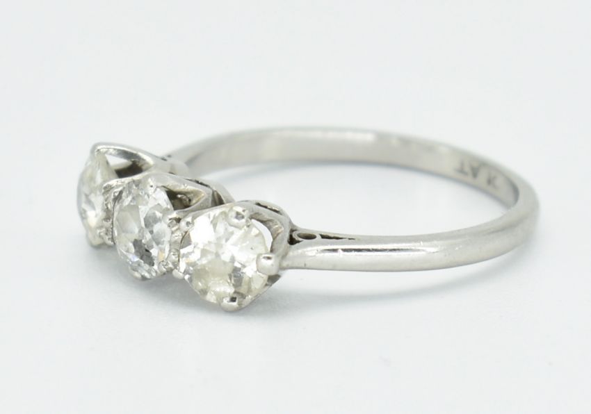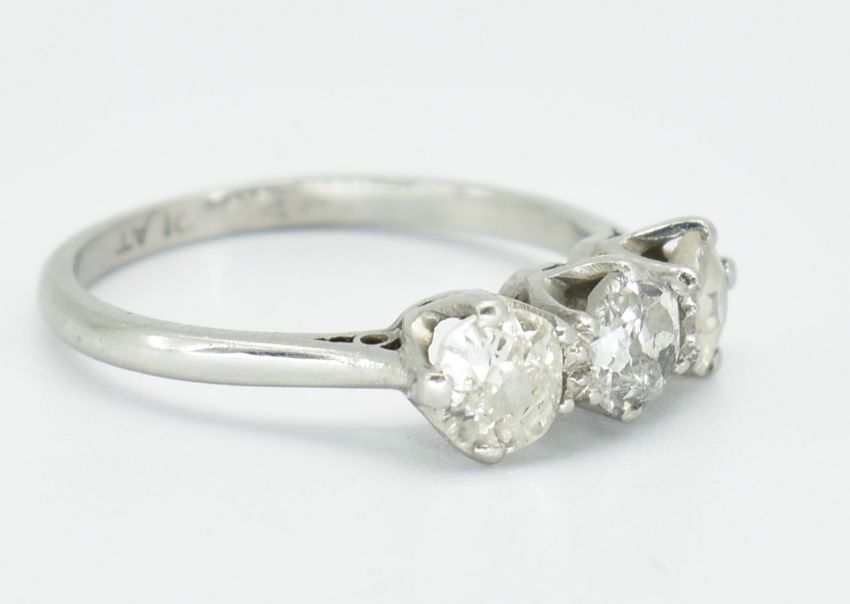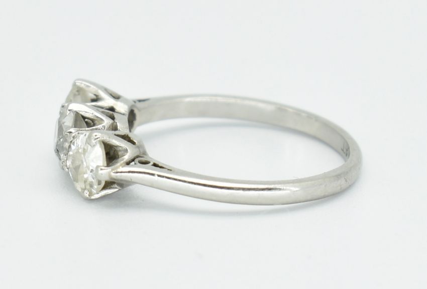 A platinum and diamond three stone ring. The ring set with three old cut diamonds within a four claw setting to plain tapering band. Estimated total diamond weight 1.ct.  Estimated Clarity SI-P1. Marked PLAT. Weight 3.19g Size L.5.