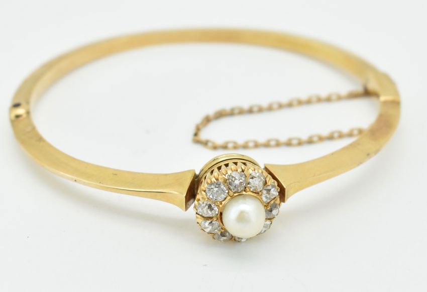 A French 18ct gold diamond and pearl hinged bangle. The bangle set with a central pearl (pink overtone) framed by 10 old cut diamond (approx SI -VS - G - I) completed with safety chain. French assay import mark to clasp. Weight 15.83g. Measures approx 7.5 inches inside circumference.