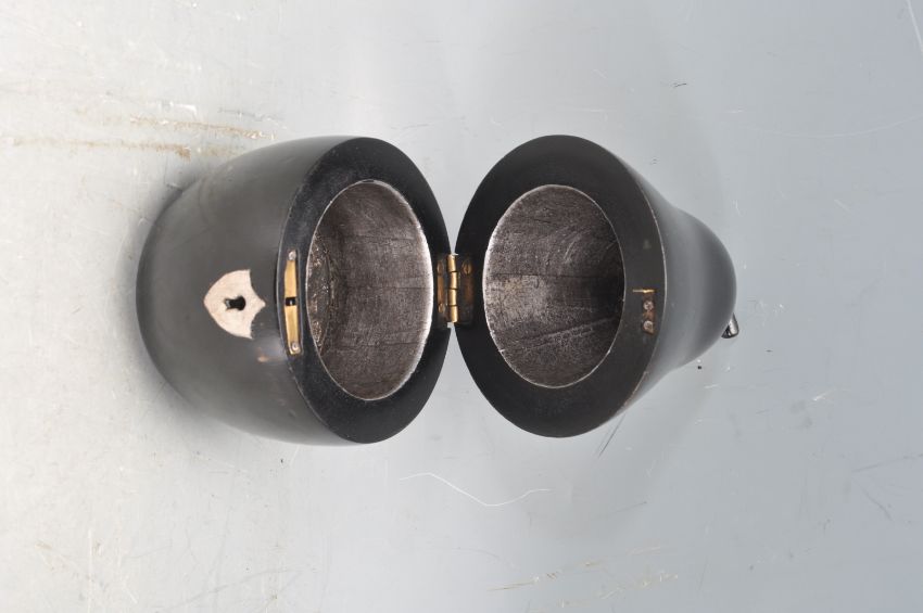 An antique Georgian style tea caddy formed of ebonised wood in the form of a pear with hinged lid and circular compartment within. Measures 20cm tall.