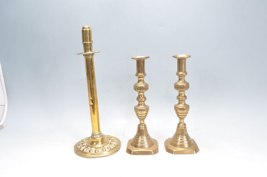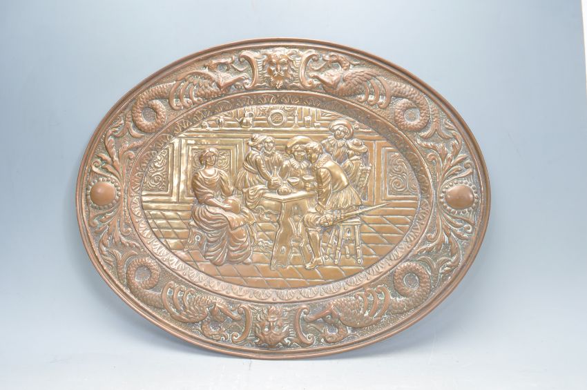 A collection of 20th century brass items to include a large tavern tray with dragon and mask border, a French armorial double handles tray, candlesticks and more. Measures 63cm x 49cm.