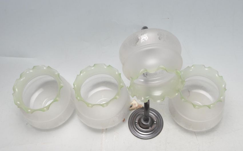 A collection of late 19th century and early 20th century glass lamp shades of various sizes and shapes with scrolled edges.