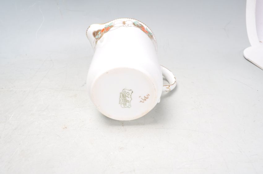 A vintage 20th century ceramic porcelain tea service by Shelly comprising of four cups, four saucers, three side plates, sugar bowl, creamer jug along with Adams plates of various sizes. Makers mark to the underside.