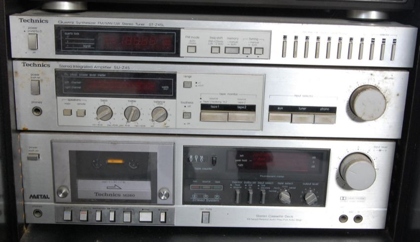 A vintage retro late 20th century Technics Hi-Fi entertaining staking system. The system comprising of a cassette player, record player / turn table, stereo integrated amplifier SU-Z45, FM/MW/LW stereo tuner ST-Z45L. All fitted in a smoke glazed music cabinet.