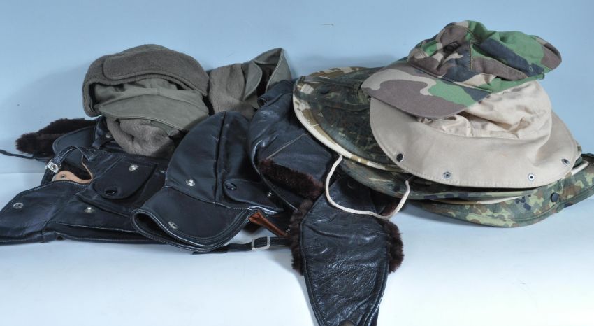 A large collection of vintage 20th century hats comprising of camouflage, leather and khaki hats. Collection includes round brimmed hats and caps.  Manufacturers include E Fritsch KG, Colamtiss, and more.