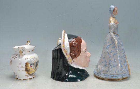 A 20th century Sitzendorf Catherine de Medicis Femmes de Henri II Germany Dresden Huge figurine, together with a Royal Doulton Queen Mary I D7188 toby jug and a Coalport Iron Bridge Dutch jug. All with makers marks underside. Measures: 28cm tallest. Condition: small brake on the Dresden figurine (the handle of the fan is broken)