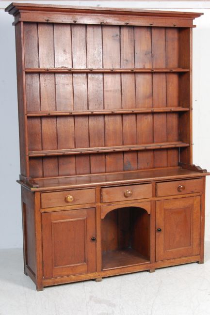 A 19th century Victorian Pembrokeshire / Welsh teak dresser having a flared cornice over a three tier open fronted plate rack raised on a dresser base. The dresser base has a central dog kennel flanked by single door cupboards raised on bracket feet. Measures 210 x 153 x 45cm.