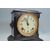 An antique late 19th century early 20th century ebonised metal slate style mantel clock having a flared top with gilt embellishments with a enamel clock face with Arabic numerals to the chapter ring raised on pediment base.