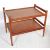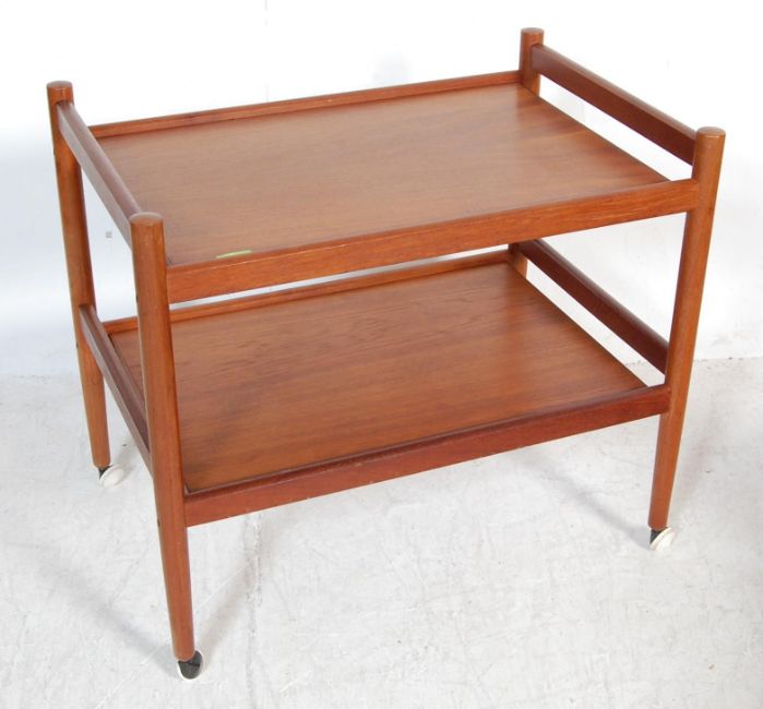 A retro vintage 20th century teak wood Danish inspired two tear serving trolley / cocktail trolley. The trolley of a rectangular form with a single push handle to one side raised on turned supports with casters. Measures 62cm h x 71cm w x 47cm d