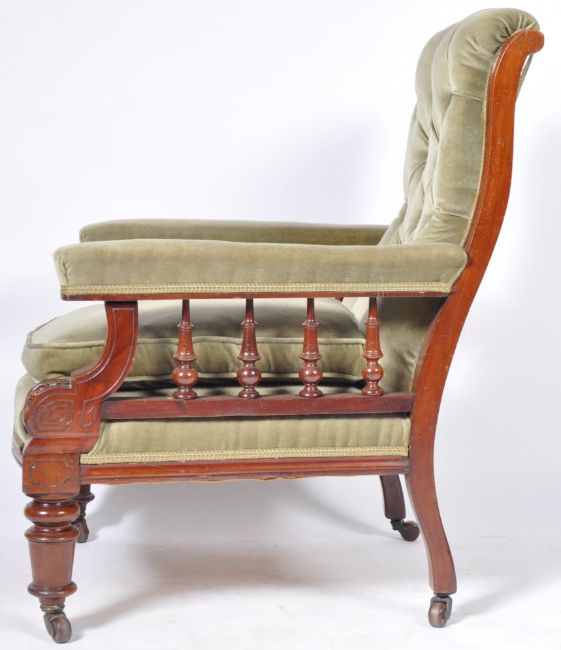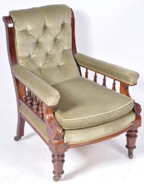 An antique 19th Century Victorian English mahogany armchair / fireside club library reading arm chair having a tall sloping button backed backrest with tapering armrests supported by turned spindles. The chair being upholstered in a green fabric with lace piping with all being raised on tuned carved supports upon castors. Measures approx 96cm x 68cm x 75cm.