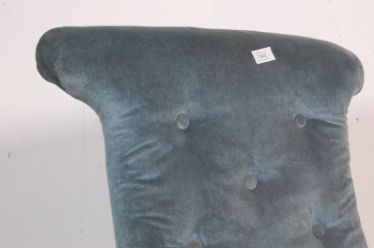 A Victorian 19th century mahogany upholstered prie dieu / prayer chair. Raised on turned mahogany legs with castors supporting a tall prayer back and open overstuffed seat in blue dralon fabric being finished with a frilled rope apron. Measures 94 x 46cm.