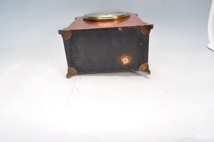 An early 20th century Edwardian oak cased dome topped 8 day mantle clock having brass finial embellishments with a silvered clock face with roman numerals to the chapter ring. The clock has an inlaid star decoration to the case raised on brass bracket feet. Measures 27cm.